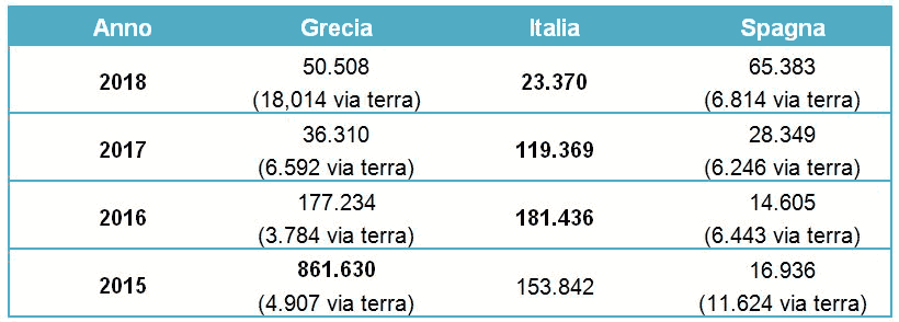 Tale dato include gli arrivi via mare in Italia, Cipro e Malta, e gli arrivi via mare e via terra in Grecia e Spagna.